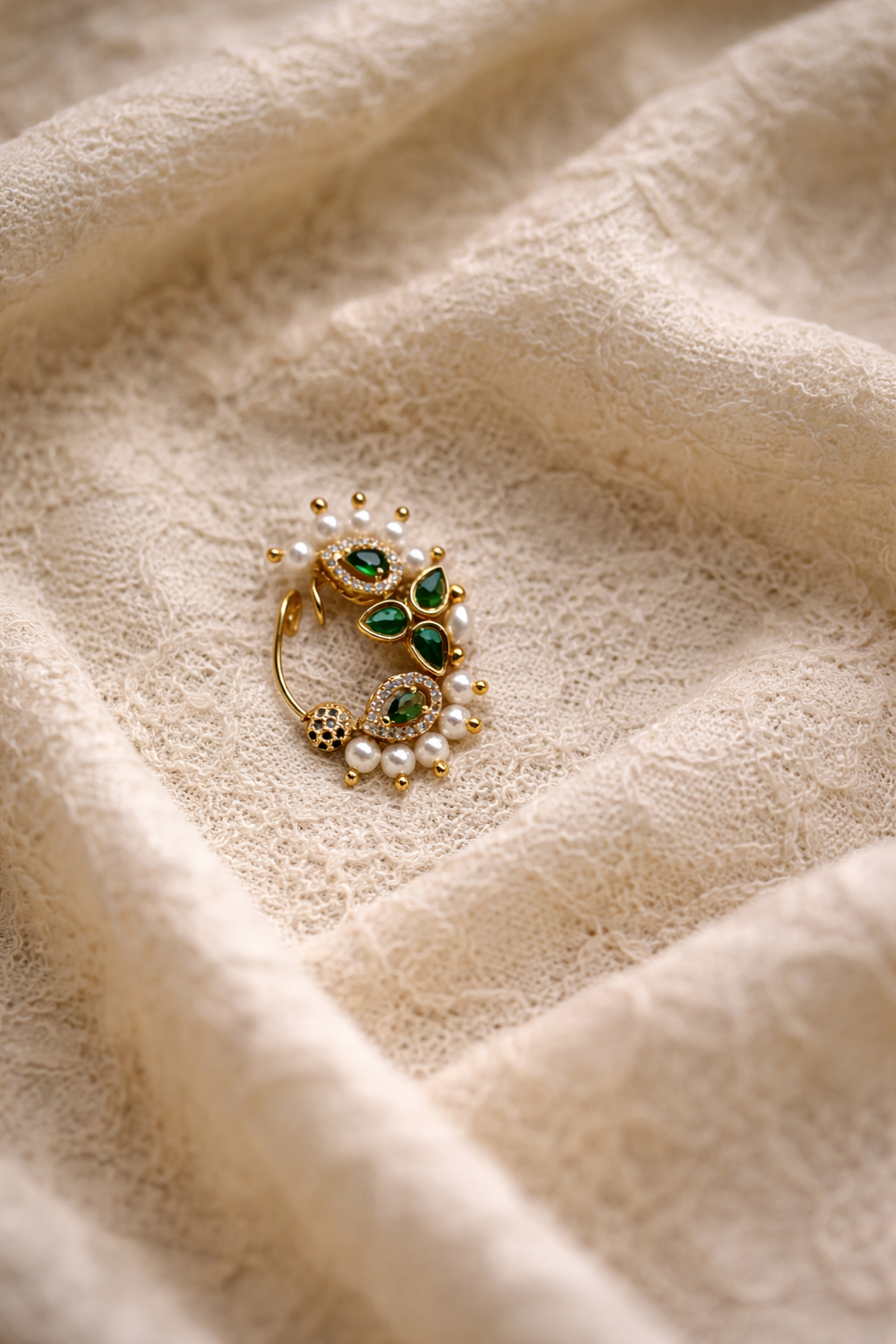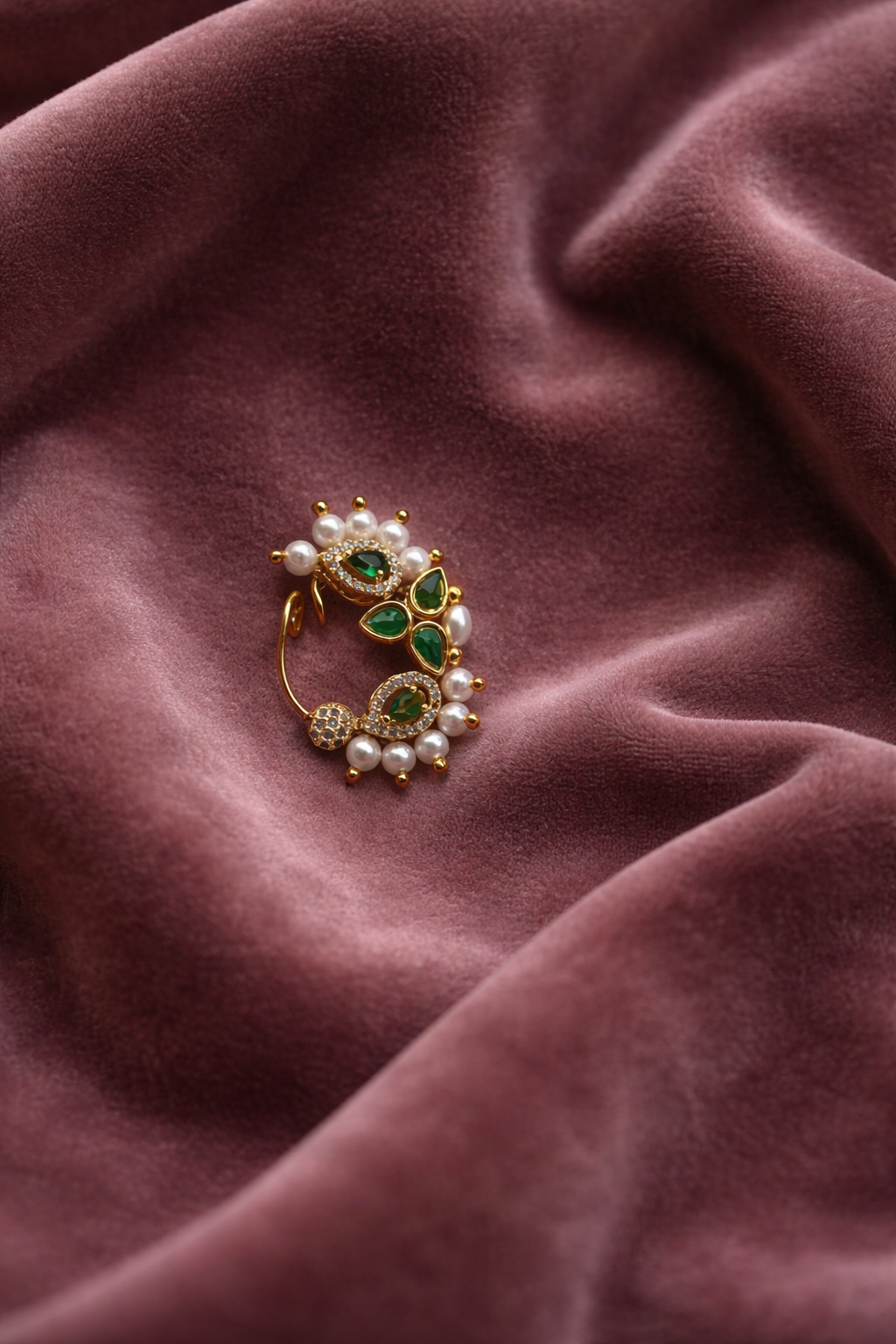 The design features a delicate crescent-shaped gold-toned base adorned with vibrant green stones arranged in a floral pattern at the center. These stones add a royal and refreshing touch, symbolizing grace, prosperity, and beauty. Surrounding the design are finely placed lustrous pearls that create a soft, elegant frame, enhancing the overall charm of the piece.