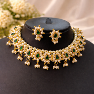 Perfect for those who love classic and elegant jewellery, the Maharani Emerald Pearl Set is more than just an accessory—it’s a statement of grace, tradition, and refined style. Add this timeless piece to your collection and embrace the charm of royal elegance with every wear.