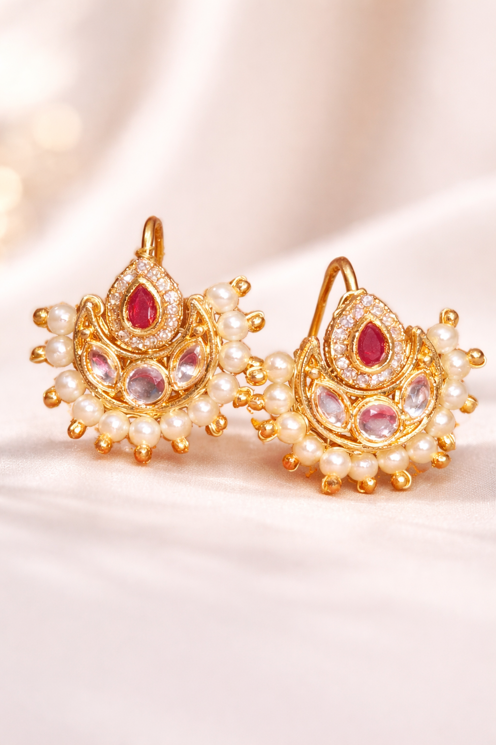 1. Embrace timeless elegance with this beautifully handcrafted Bugdi, featuring cascading clusters of lustrous white pearls delicately strung along a sleek gold-tone wire. Designed to rest gracefully along the ear contour, this Bugdi offers a classic yet contemporary charm. A perfect blend of tradition and sophistication, ideal for cultural events, bridal wear, or festive ensembles.