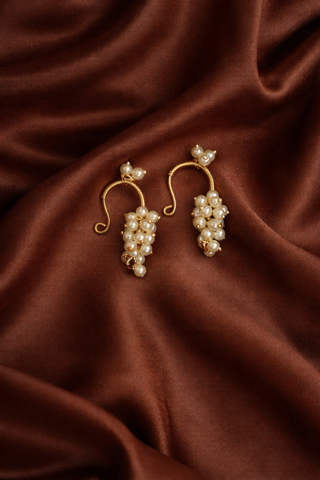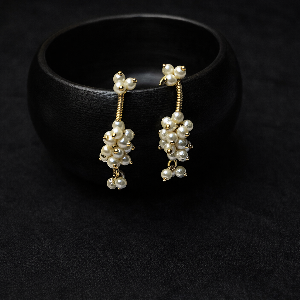 Embrace timeless elegance with this beautifully handcrafted Bugdi, featuring cascading clusters of lustrous white pearls delicately strung along a sleek gold-tone wire. Designed to rest gracefully along the ear contour, this Bugdi offers a classic yet contemporary charm. A perfect blend of tradition and sophistication, ideal for cultural events, bridal wear, or festive ensembles.